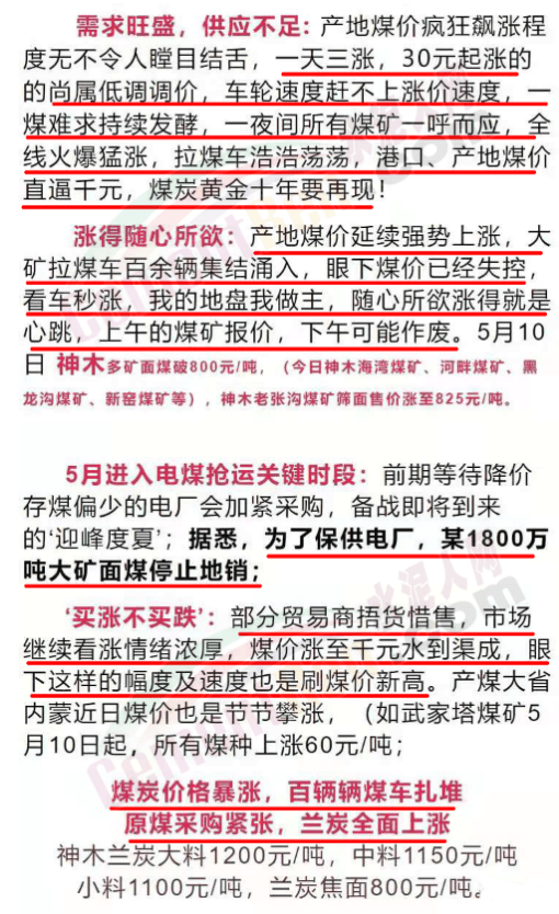 產(chǎn)地煤價瘋狂飆漲程度無不令人瞠目結(jié)舌,一天三漲,30元起的尚屬低調(diào)調(diào)價,車輪速度趕不上漲價速度,一煤難求持續(xù)發(fā)酵,一夜間所有煤礦一呼而應(yīng),全線火爆猛漲,拉煤車浩浩蕩蕩,港口、產(chǎn)地煤直逼千元,煤炭黃金十年要再現(xiàn)!