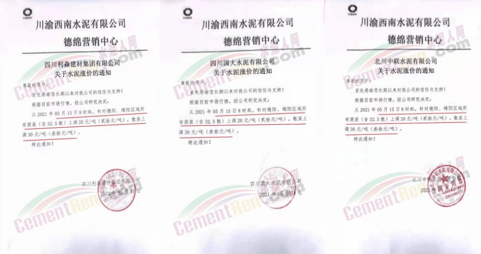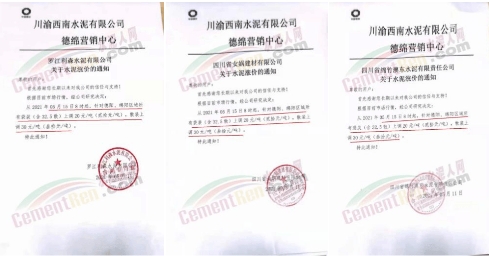 據(jù)四川德陽、綿陽地區(qū)水泥廠相關(guān)人員反饋,該廠采購的煤炭自春節(jié)以來,價格累計上漲180元/噸,目前到位價已經(jīng)超過1000元/噸。對水泥生產(chǎn)成本影響較大,而近期四川環(huán)保整治力度加強,水泥廠熟料線執(zhí)行錯峰生產(chǎn),整體熟料庫存低位,區(qū)域主要品牌企業(yè)已經(jīng)通知5月15日德綿陽地區(qū)水泥價格上漲20-30元/噸。