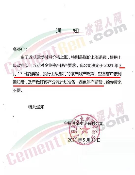 水泥人網通訊員消息:5月13日,寧夏勝金水泥有限公司通知,由于近期原燃材料價格上漲,特別是煤價上漲迅猛,根據上級政府部門近期對企業停產限產要求,公司決定于2021年5月17日凌晨起,執行上級部門的停產限產政策,望各客戶接到通知后,及早做好停產分流計劃準備,避免停產斷貨。