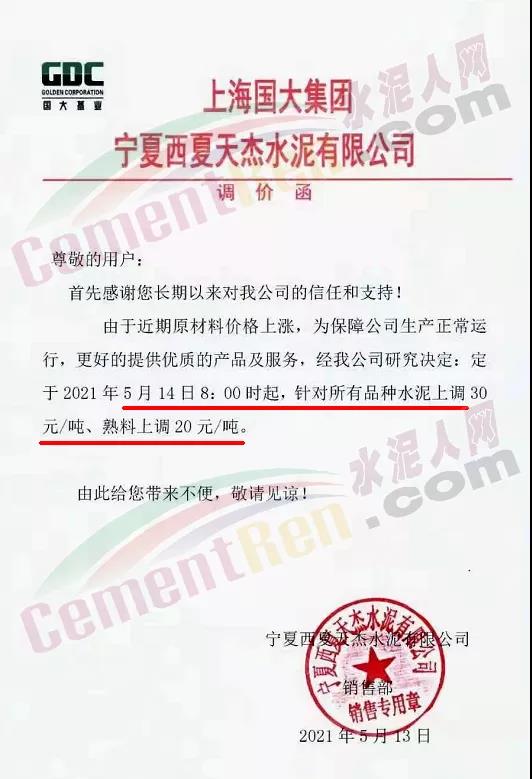 寧夏青銅峽水泥股份有限公司通知由于今年以來原燃材料價格大幅連續上漲,致使公司生產成本大幅攀升,經公司總經理辦公會研究決定,自2021年5月14日零點起,各品種水泥銷售價格在目前基礎上上調30元/噸;熟料銷售價格在目前基礎上上調20元/噸。上述所調整價格為現金價格,承兌在此價格基礎上上浮3%。