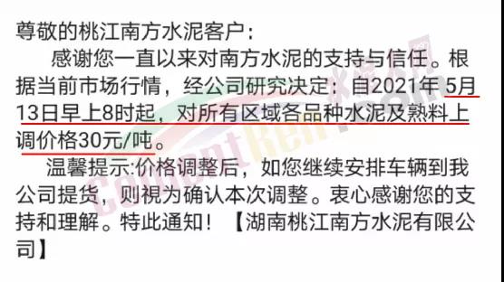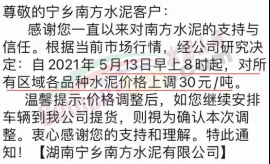 湖南桃江南方水泥通知,根據當前市場行情,經公司研究決定∶自2021年5月13日早上8時起,對所有區域各品種水泥及熟料上調價格30元/噸。