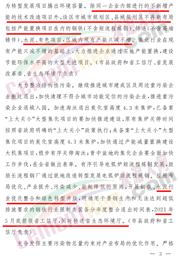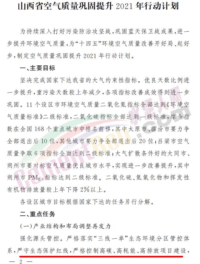 《行動計劃》提到,山西省將在產業結構和布局調整上再發力,強化源頭管控。嚴格落實“三線一單”生態環境分區管控體系,嚴守生態保護紅線,嚴格控制高碳、高耗能、高排放項目建設,為轉型發展項目騰出環境容量。除同一企業內部進行的不新增產能的技術改造項目外,設區市城市規劃區、縣城規劃區不再新布局包括產能置換項目在內的鋼鐵、鑄造、水泥等項目,區域內現有產能只減不增。