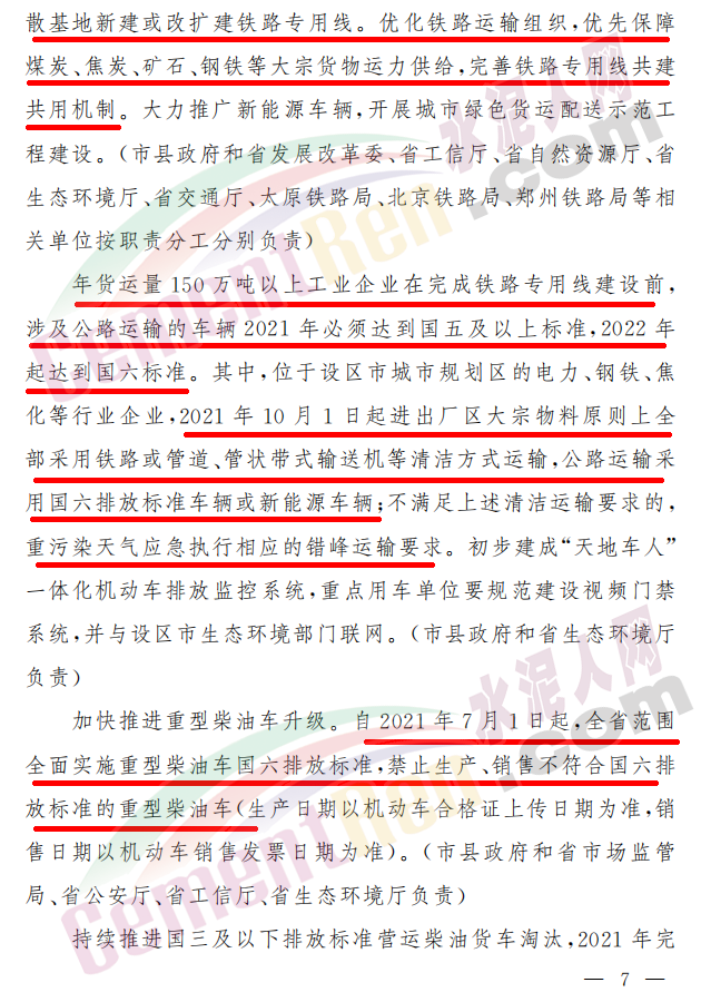 年貨運量150萬噸以上工業企業在完成鐵路專用線建設前,涉及公路運輸的車輛2021年必須達到國五及以上標準,2022年起達到國六標準。其中,位于設區市城市規劃區的電力、鋼鐵、焦化等行業企業,2021年10月1日起進出廠區大宗物料原則上全部采用鐵路或管道、管狀帶式輸送機等清潔方式運輸,公路運輸采用國六排放標準車輛或新能源車輛;不滿足上述清潔運輸要求的,重污染天氣應急執行相應的錯峰運輸要求。初步建成“天地車人”一體化機動車排放監控系統,重點用車單位要規范建設視頻門禁系統,并與設區市生態環境部門聯網。加快推進重型柴油車升級。