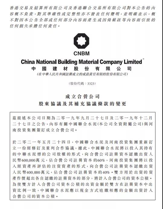 日前,中國建材上市公司發布公告稱,2021年5月24日,中國聯合水泥及河南投資集團重新訂立一份經修訂及重列合作協議,據此,中國聯合水泥將以投入其持有的中聯水泥標的公司股權的形式,向合營公司注冊資本認繳出資人民幣600,000萬元,占合營公司注冊資本的60%,河南投資集團將以投入經資產再評估的注資資產的形式,向合營公司注冊資本認繳出資人民幣400,000萬元,占合營公司注冊資本的40%。雙方用于出資的資產作價超出各自認繳的注冊資本的部分,將計入合營公司的資本公積。為使雙方計入合營公司資本公積的出資金額于雙方在注冊資本中出資比例一致,中國聯合水泥應以現金方式追繳相應的金額出資計入合營公司的資本公積。