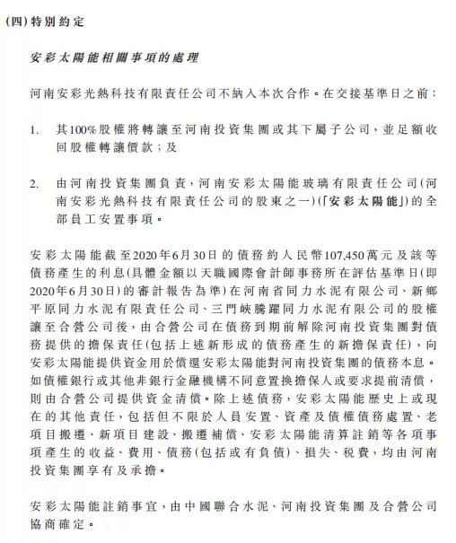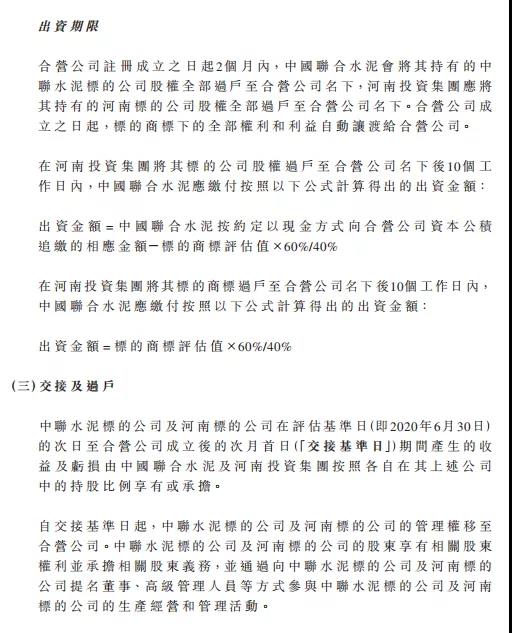 合營公司注冊成立之日起2個月內,中國聯合水泥會將其持有的中聯水泥標的公司股權全部過戶至合營公司名下,河南投資集團應將其持有的河南標的公司股權全部過戶至合營公司名下。合營公司成立之日起,標的商標下的全部權利和利益自動讓渡給合營公司。