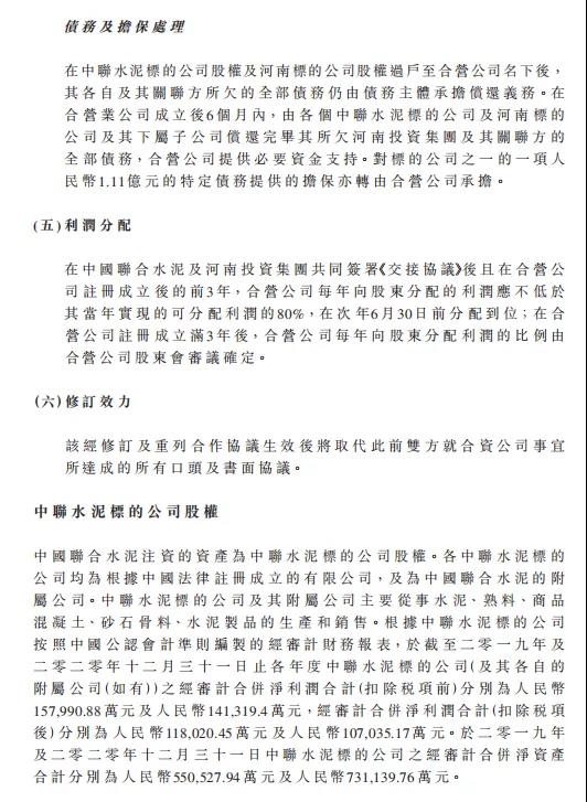 為使雙方計入合營公司資本公積的出資金額于雙方在注冊資本中出資比例一致,中國聯合水泥應以現金方式追繳相應的金額出資計入合營公司的資本公積。據此,中國聯合水泥總計于合營公司承諾投入的資本金為人民幣829,231.58萬元。