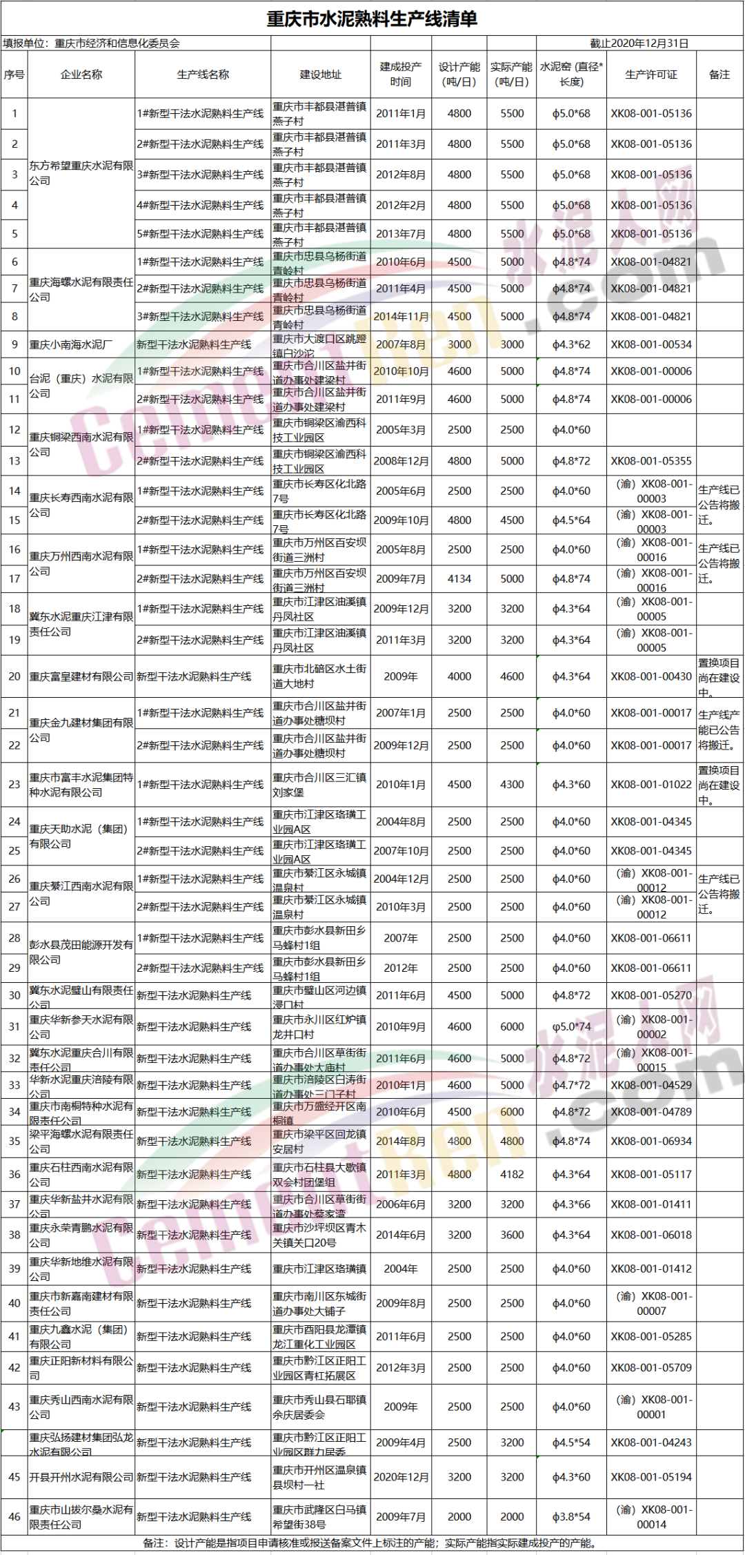 日前,重慶市經濟和信息化委員會發布《關于重慶市水泥熟料平板玻璃生產線清單更新公示》,清單顯示,重慶市共有46條水泥熟料生產線,合計年產能5294.46萬噸,其中,2條水泥熟料生產線產能已公告將搬遷,6條水泥熟料生產線已公告將搬遷,2條水泥熟料生產線置換項目尚在建設中。