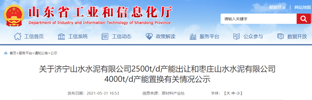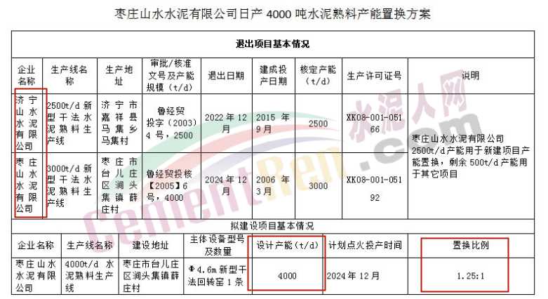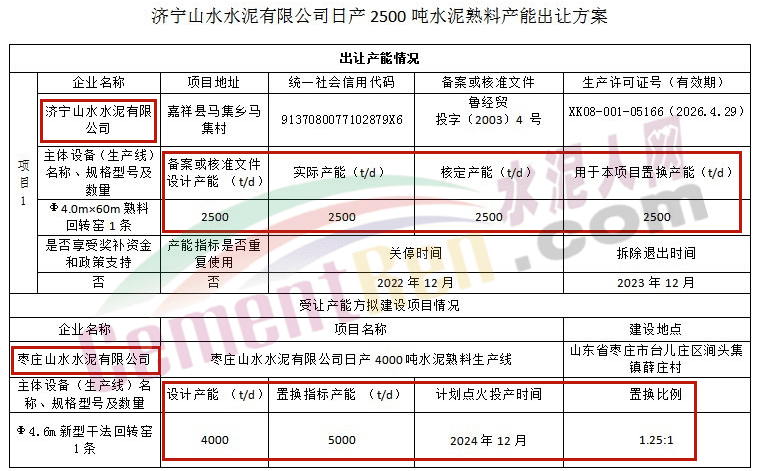 日前,山東省工業和信息化廳發布《關于濟寧山水水泥有限公司2500t/d產能出讓和棗莊山水水泥有限公司4000t/d產能置換有關情況公示》,公示期2021年5月31日至6月4日。產能出讓方案顯示,濟寧山水水泥、棗莊山水水泥分別退出2500t/d、3000t/d熟料生產線各一條,用于在山東棗莊市臺兒莊區新建一條4000t/d熟料生產線,新建生產線計劃點火投產時間為2024年12月,置換比例為1.25:1。詳情如下: