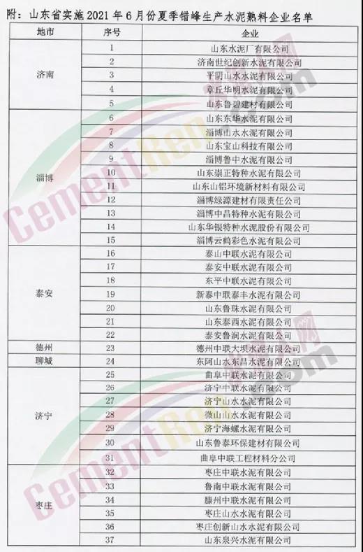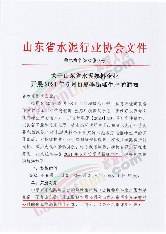 6月2日,山東省水泥協會發布《關于山東省水泥熟料企業開展2021年6月份夏季錯峰生產的通知》給山東省內熟料企業稱,按照相關文件要求,為持續推進行業供給側結構性改革、有效壓減熟料產能發揮、減少大氣污染物排放,結合山東省實際,決定組織實施2021年6月份夏季錯峰生產。實施時間2021年6月11日時至6月30日24時,共20天。實施對象為山東省水泥熟料企業的熟料生產線(含特種熟料生產線和建通窯、不含山東魯北化工股份有限公司和山東匯泰再生資源有限公司的化工配套熟料生產線)。