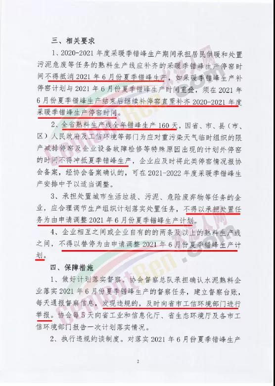 4、做好總結分析。2021年6月份夏季錯峰生產結束后,協會將召開會議,對各熟料企業執行情況進行總結通報,并建檔備案作為協會為相關熟料企業申報綠色工廠出具證明的依據。