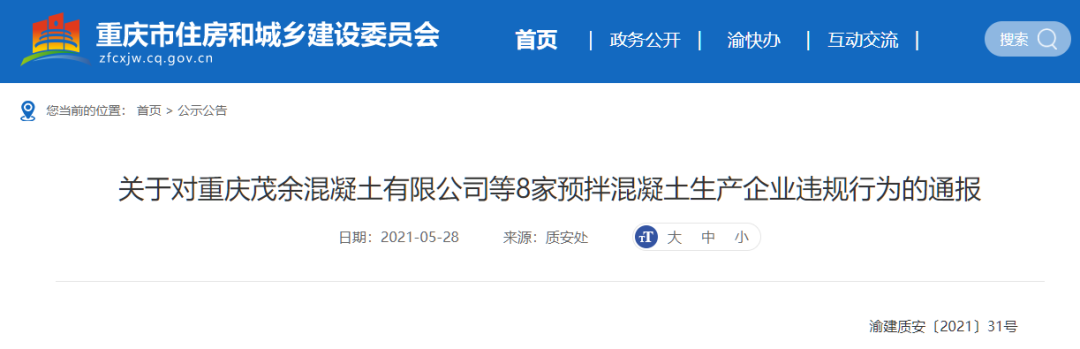 重慶茂余混凝土有限公司、重慶市城投混凝土有限公司、重慶華冠混凝土有限公司、重慶三圣實業股份有限公司、重慶首溪建材有限公司、重慶鐵川混凝土工程有限公司、重慶建典混凝土有限公司、重慶遠立新型建材有限公司等8家預拌混凝土生產企業未切實履行生產質量責任,未按相關法律、法規和工程建設強制性標準開展預拌混凝土質量控制工作,予以全市通報批評,記入不良信用信息六個月。