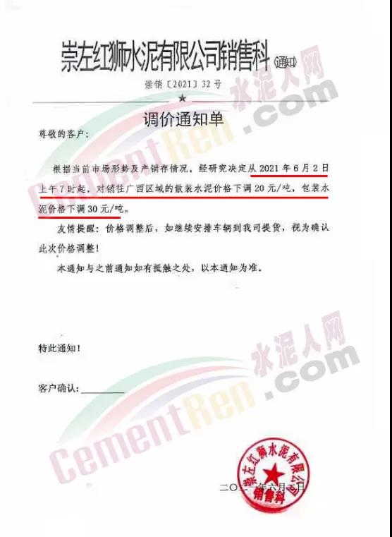 根據(jù)當(dāng)前市場(chǎng)形勢(shì),經(jīng)研究決定,我公司于2021年6月2日07:00起對(duì)銷往廣西區(qū)域的散裝水泥價(jià)格下調(diào)20元/噸,包裝水泥價(jià)格下調(diào)30元/噸。