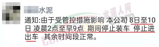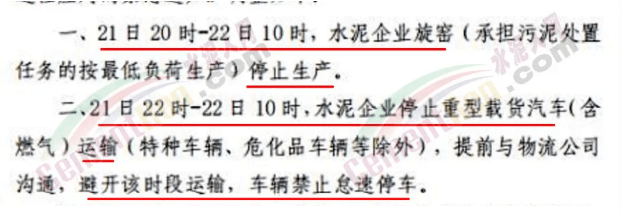 每日2時至9時,所有企業重型柴油貨車允許進廠、不允許出廠,避免運輸車輛在大門口怠速停車。應上述要求,區域內水泥企業陸續通知下游客戶停止裝車以及停止運輸車輛進廠時段。
