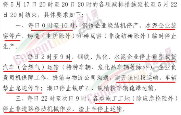 5月17日20時至20日20時的各項減排措施延長至5月22日20時結束。每日0時至10時,水泥企業旋窯停產;每日2時至9時,水泥企業停止重型載貨汽車運輸。每日22時至次日9時,各類施工工地停止非道路移動機械作業,渣土車停止運輸。
