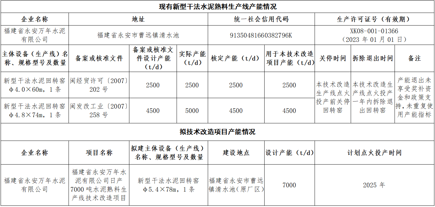 日前,福建省工信廳發布《關于福建省永安萬年水泥有限公司日產7000噸水泥熟料生產線技術改造項目產能情況的公示》,公示顯示,福建省永安萬年水泥有限公司擬拆除整合公司現有的1條日產2500噸和1條日產4500噸水泥熟料生產線,在原廠區技術改造建設1條日產7000噸水泥熟料生產線。具體公示如下: