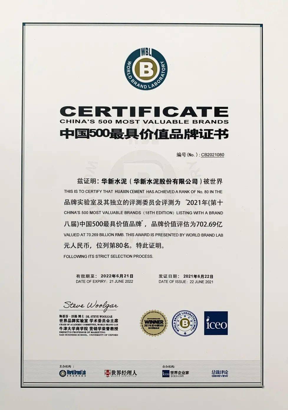 6月22日,由世界品牌實驗室(WorldBrandLab)主辦的第十八屆“世界品牌大會”在北京舉行,會上發布了2021年《中國500最具價值品牌》榜單,華新水泥以702.69億元的品牌價值位列榜單第80位,較去年上漲了103.94億元,這是華新連續第九年上榜。