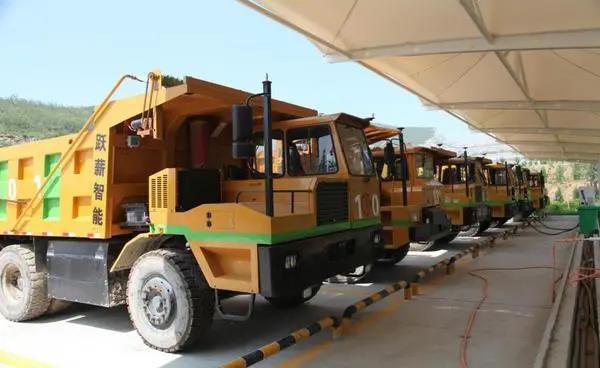 河南能源焦煤公司千業水泥5G無人駕駛運輸車正在充電站進行充電攝影/劉建軍