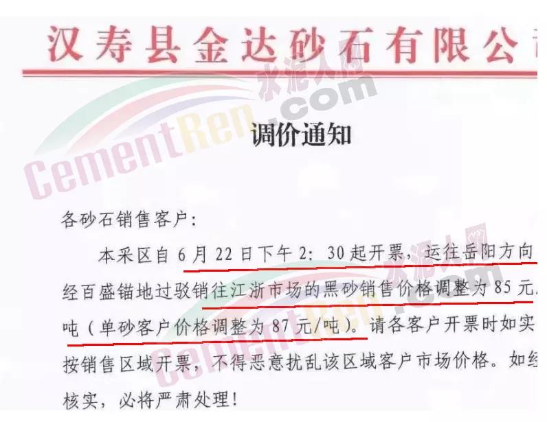 湖南省漢壽縣金達砂石有限公司發布調價通知,自6月22日下午2:30起開票,運往岳陽方向經百盛錨地過駁銷往江浙市場的黑砂銷售價格調整為85元/噸(單砂客戶價格調整為87元/噸)。