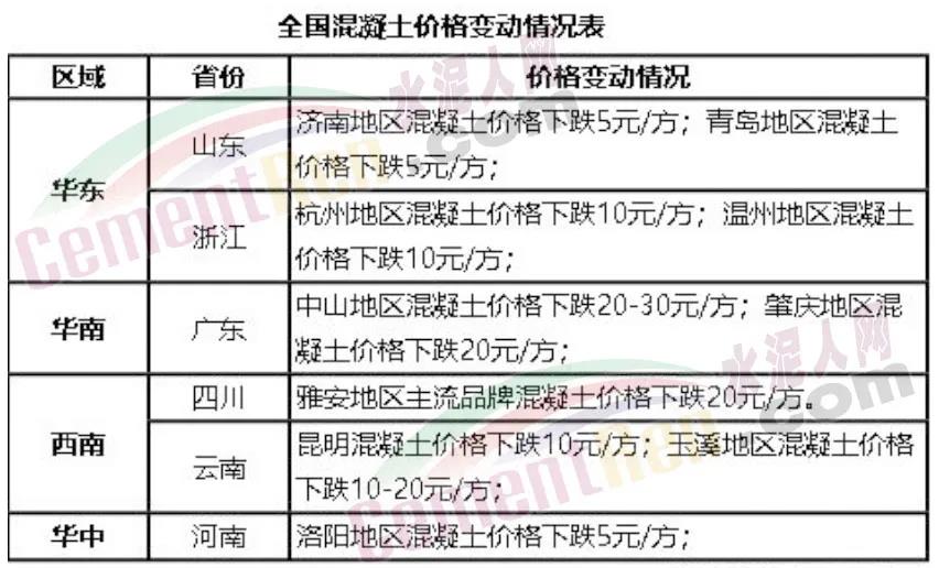 混凝土價格方面,上周全國混凝土價格繼續下跌,華東區域原材行情弱勢,價格小幅下跌;華南區域原材下跌,混凝土價格下行;華北區域市場需求疲軟,價格穩中偏弱運行;華中區域成本降低,混凝土價格持穩運行;西南區域原材料價格下行,商混價格小幅下跌;東北區域原材價格上漲,價格偏強運行;西北區域原材價格回落,市場價格暫穩。