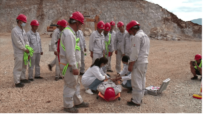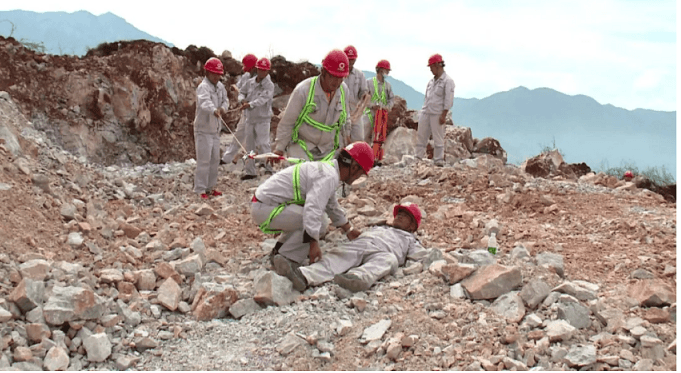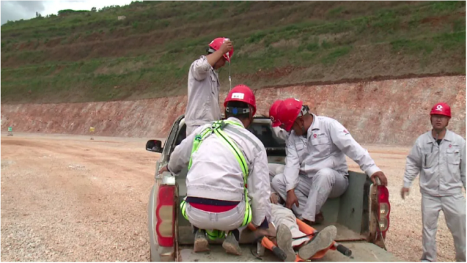 事故模擬礦山2327-2339平臺進行爆破作業后,爆破員楊某和袁某準備對爆堆進行爆后安全檢查,兩人一前一后走向爆堆,就在此時,楊某所在平臺區域突然發生溶洞坍塌,由于事發突然躲避不及,楊某隨塌陷區域掉入溶洞,右腳被壓無法移動,右腳小腿有出血現象,由于出血量多,傷員逐漸進入昏迷狀態,需迅速救治。見此狀況,袁某認真查看了現場情況,對傷者楊某簡單安慰后立即將事故現場情況報告給值班領導。公司調度員和值班領導接到報告后,立即啟動《礦山溶洞坍塌事故應急救援預案》,并按各自職責組織相關人員,成立臨時應急救援小組,趕赴事發現場,進行應急救援處置。救援小組人員到達現場后,警戒小組立即在坍塌區域范圍內進行警戒,禁止人員、設備靠近。由現場指揮組織技術人員對溶洞進行勘察、評估,擬定救援方案。同時參加救援的應急救援組、醫療救護組、善后保障組根據救援方案,立即展開救援。整個演練過程,各參演小組聽從指揮,統一行動,快速反應,分工協作,順利完成了緊急疏散、信息報告、現場警戒、現場搶險救援、醫療急救、檢測保障等工作,直至應急響應終止,達到了應急演練的預期目的。