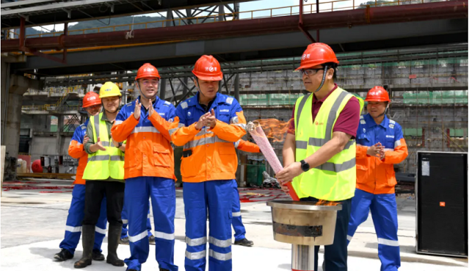 華新公司黨委書記、總裁李葉青為華新設(shè)計制造的全套國產(chǎn)化設(shè)備萬噸線投產(chǎn)點火