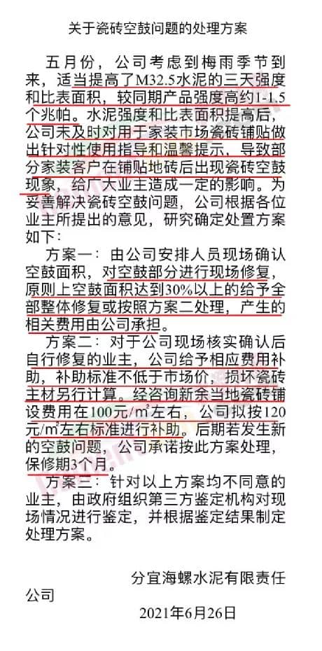 水泥強度和比表面積提高后,公司未及時對用于家裝市場瓷磚鋪貼做出針對性使用指導和溫馨提示,導致部分家裝客戶在鋪貼地磚后出現瓷磚空鼓現象,給廣大業主造成一定的影響。為妥善解決瓷磚空鼓問題,公司根據各位業主所提出的意見,研究確定處置方案如下∶