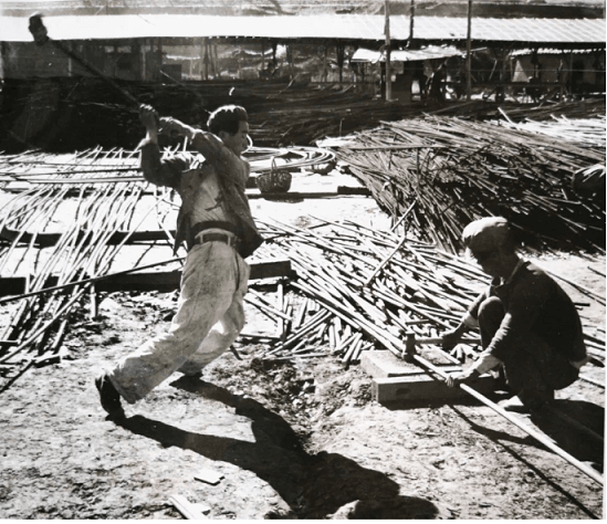 照片中的主人公傅德成是熱火朝天地參與永登水泥廠建設的一員,從白山黑水的東北來到莽莽蒼蒼的西北,他全神貫注地盯著目標,踮起腳尖,腰身前弓,張開雙臂,掄起20多磅重的大錘,鉚足全身的力氣,準備軋斷25#圓鋼。不遠處,已經有一堆軋好的圓鋼靜靜等待著被搬去施工……