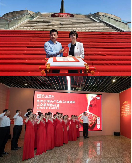 健跑前夕,孫力實向中華世紀壇贈送了新材料印章,廣大黨員參觀中華世紀壇舉辦的“印記初心——慶祝中國共產黨成立100周年大眾篆刻作品展”,并開展重溫入黨誓詞活動。