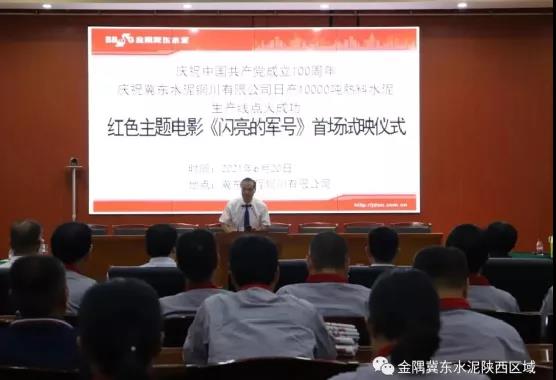 弘揚照金精神,傳承紅色基因,支持文化事業,助推國企發展。2021年6月20日上午,紅色主題電影《閃亮的軍號》首場試映儀式在冀東水泥銅川有限公司舉行。本次試映,旨在向中國共產黨成立100周年獻禮,慶祝冀東水泥銅川有限公司惠塬工業園日產10000噸熟料水泥生產線即將帶料試生產。