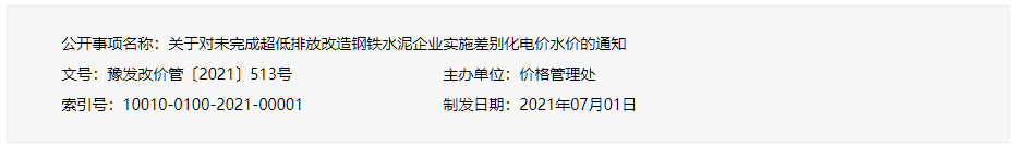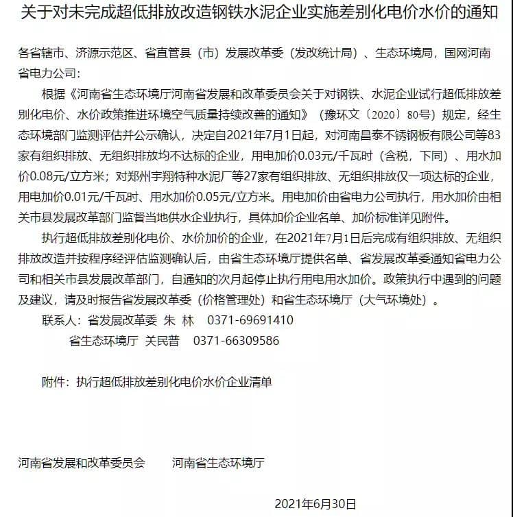 7月1日,河南省發(fā)改委發(fā)布《關(guān)于對(duì)未完成超低排放改造鋼鐵水泥企業(yè)實(shí)施差別化電價(jià)水價(jià)的通知》。根據(jù)通知,河南省發(fā)改委決定自2021年7月1日起,對(duì)河南昌泰不銹鋼板有限公司等83家有組織排放、無(wú)組織排放均不達(dá)標(biāo)的企業(yè),用電加價(jià)0.03元/千瓦時(shí)、用水加價(jià)0.08元/立方米;對(duì)鄭州宇翔特種水泥廠等27家有組織排放、無(wú)組織排放僅一項(xiàng)達(dá)標(biāo)的企業(yè),用電加價(jià)0.01元/千瓦時(shí)、用水加價(jià)0.05元/立方米。
