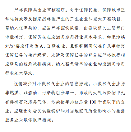 各地要認真對保障民生、保障城市正常運轉或涉及國家戰略性產業企業申報資料進行審核和現場核查,確需納入保障類的,應當嚴格控制數量。原則上,對于保障類企業,須達到國家或河南省重點行業績效分級B級及以上要求;對達不到B級及以上要求企業要實施重點幫扶,組織專業技術人員對其進行全面會診、把脈,督促其加快治理進度,盡快達到B級水平。在重污染天氣管控期間,保障類企業僅準許從事特定保障任務的生產經營,應嚴格按照重污染天氣應急減排清單規定落實管控措施,如保障類企業超出允許生產經營范圍、保障類工程未做到綠色施工相關要求的,一經發現,應立即移出保障清單。