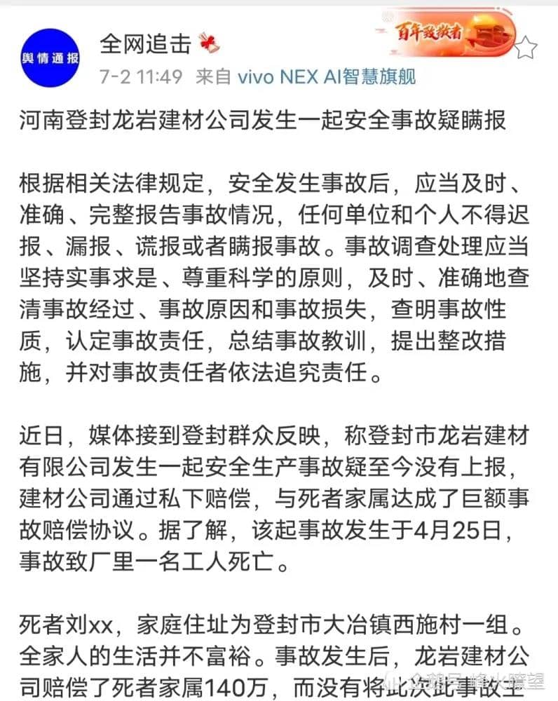 死者劉xx,家庭住址為登封市大冶鎮(zhèn)西施村一組。全家人的生活并不富裕。事故發(fā)生后,龍巖建材公司賠償了死者家屬140萬,而沒有將此次此事故主動上報政府部門,存在瞞報安全生產事故嫌疑。