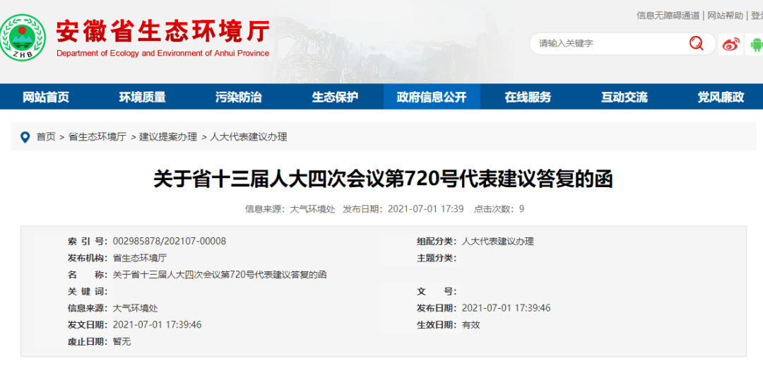 日前,安徽省生態環境廳官網發布《關于省十三屆人大四次會議第720號代表建議答復的函》稱,韓先云代表在省十三屆人大四次會議期間提出的《關于進一步加強大氣污染防治的建議》收悉,經研究辦理,并給予答復。