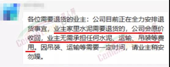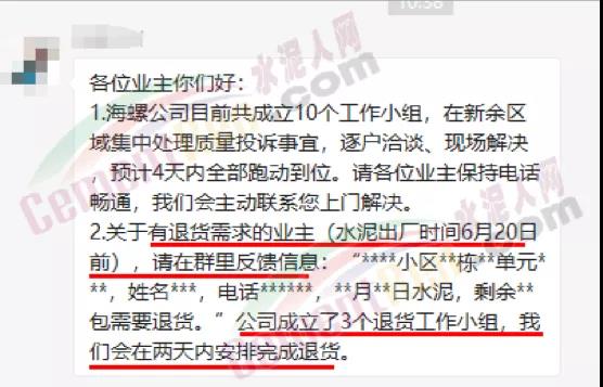 6月29日上午,海螺水泥相關(guān)負責人在業(yè)主群里發(fā)布消息稱,有退貨需求的業(yè)主,且水泥出廠時間在6月20日前的,可在群里反饋信息。公司已經(jīng)成立了3個退貨工作小組,會在兩天內(nèi)安排完成退貨。
