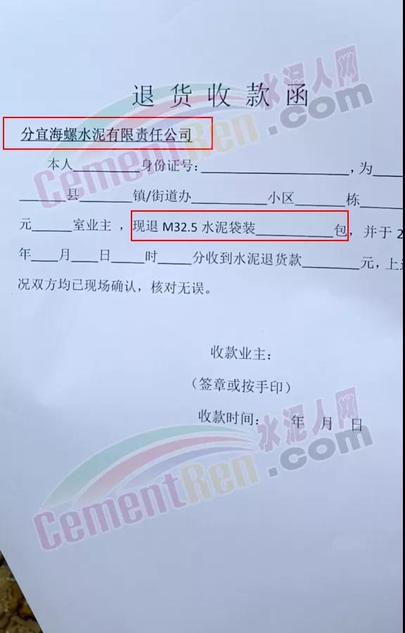 收到可以退貨的消息,業(yè)主群反饋信息陸續(xù)發(fā)出,且已有部分業(yè)主開始退貨。從視頻和退貨收款函內(nèi)容可見,退貨水泥為M32.5砌筑水泥。