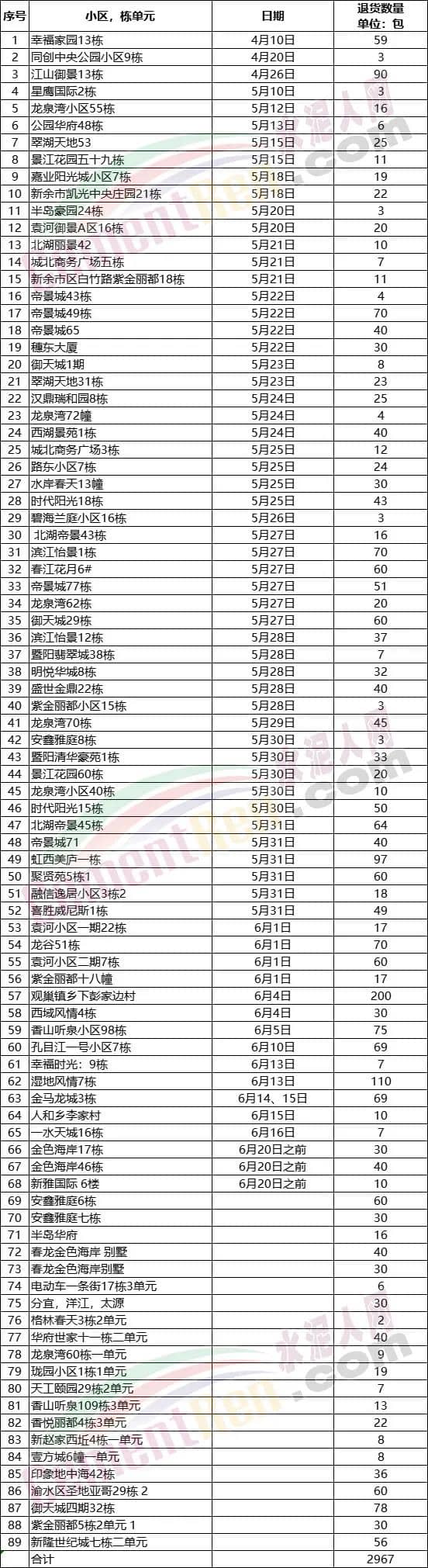 據(jù)水泥人網(wǎng)不完全統(tǒng)計,截止6月10日14時,有約2967包(約148噸)水泥反饋需要退貨。生產(chǎn)日期從4月10日至6月20日之前均有,最多的退貨200包,最少的也有2包剩余需要退貨。涉及紫金麗都、袁河小區(qū)、御天城、印象地中海、壹方城、觀巢鎮(zhèn)鄉(xiāng)下彭家邊村、濕地風情、虹西美廬、江山御景、香山聽泉等89戶業(yè)主詳細如下: