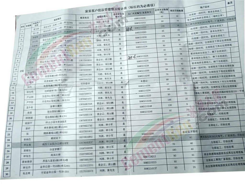 據(jù)不完全統(tǒng)計,使用水泥數(shù)量達2570噸,客戶訴求為部分或全部返工,剩余水泥退回。也有業(yè)主訴求觀察一段時間,再核實定下步處理措施。個別業(yè)主要自行處理,其費用分別為283元/平方、363元/平方由廠家承擔。