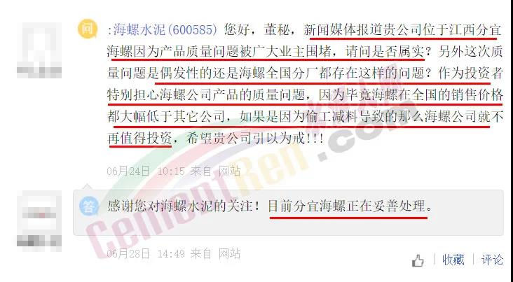 日前,有投資者在上證e互動平臺向海螺水泥提問稱,新聞媒體報道貴公司位于江西分宜海螺因為產(chǎn)品質(zhì)量問題被廣大業(yè)主圍堵,是否屬實?這次質(zhì)量問題是偶發(fā)性的還是海螺全國分廠都存在這樣的問題?作為投資者特別擔心海螺公司產(chǎn)品的質(zhì)量問題,因為畢竟海螺在全國的銷售價格都大幅低于其它公司,如果是因為偷工減料導致的那么海螺公司就不再值得投資。海螺水泥上市公司回復稱,目前分宜海螺正在妥善處理。