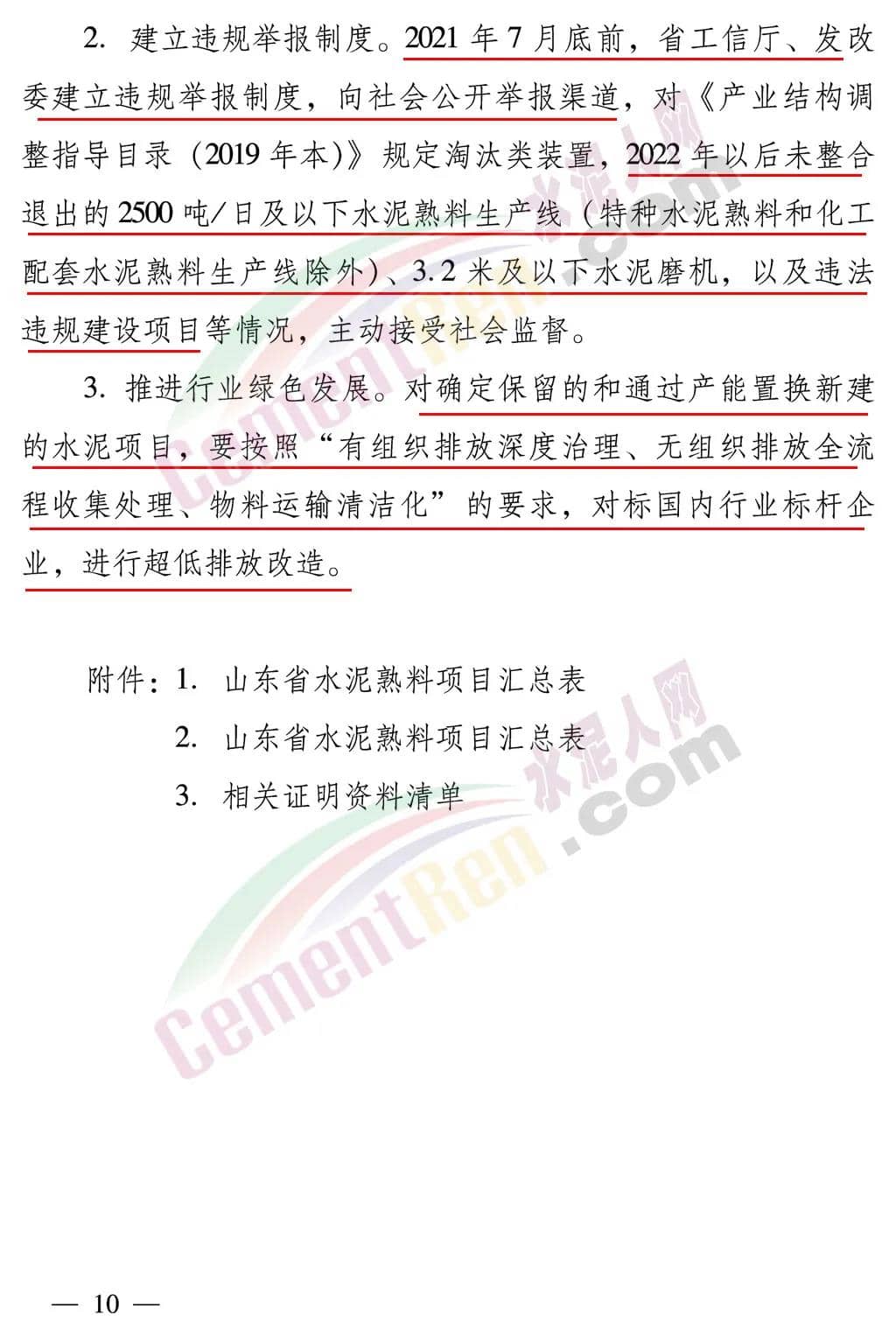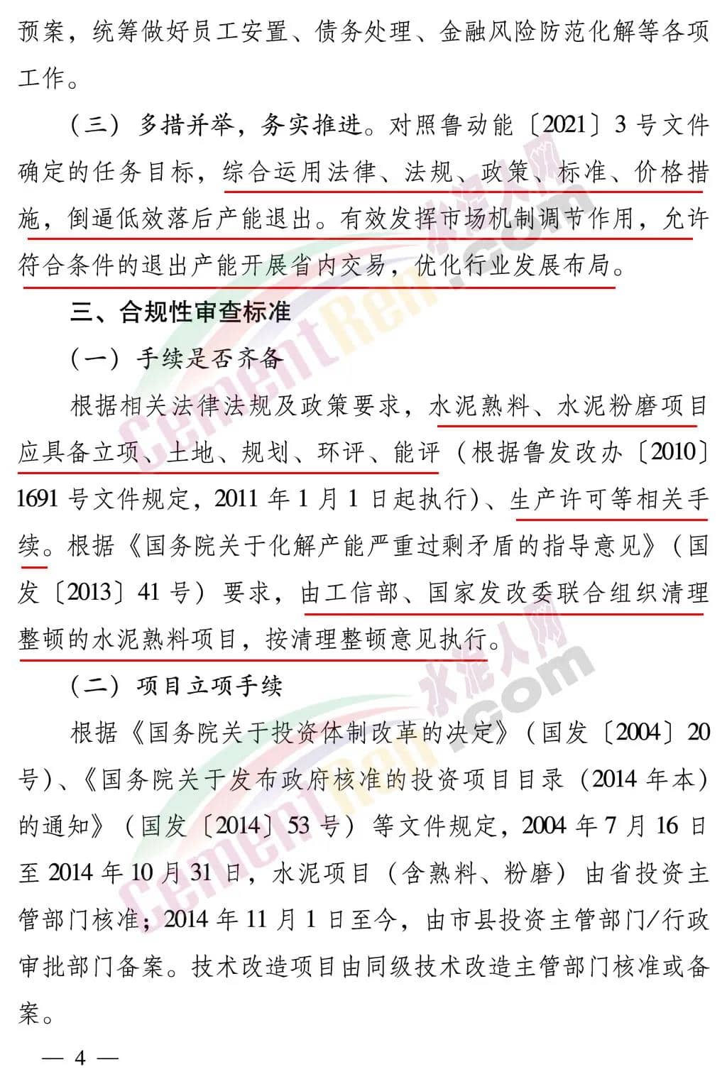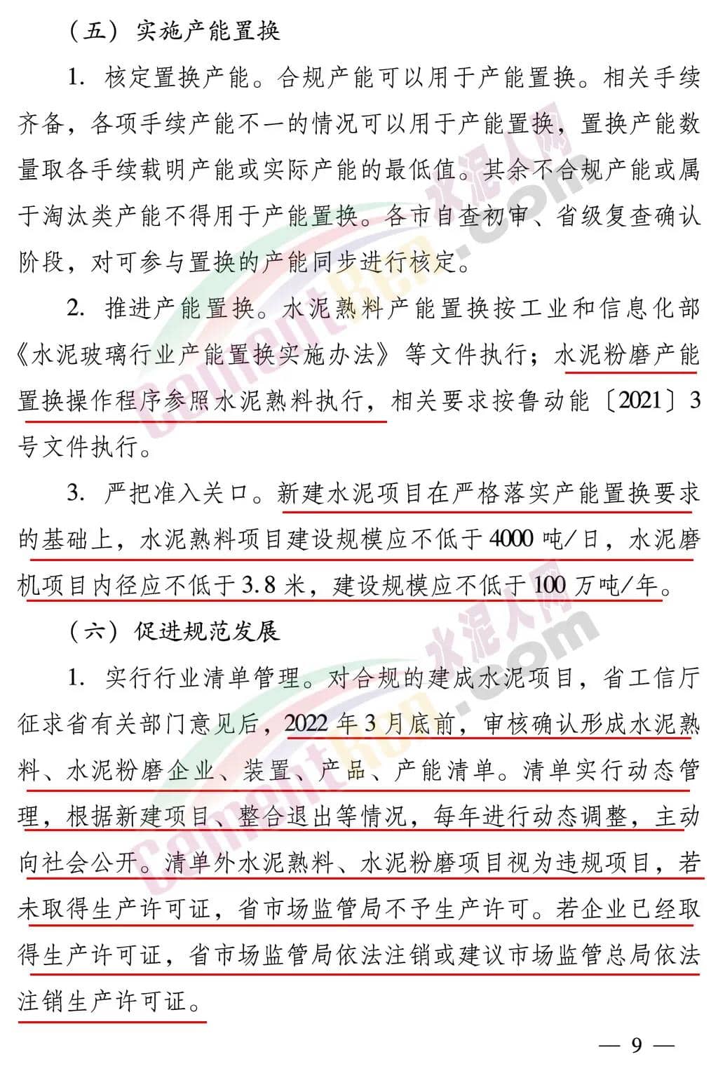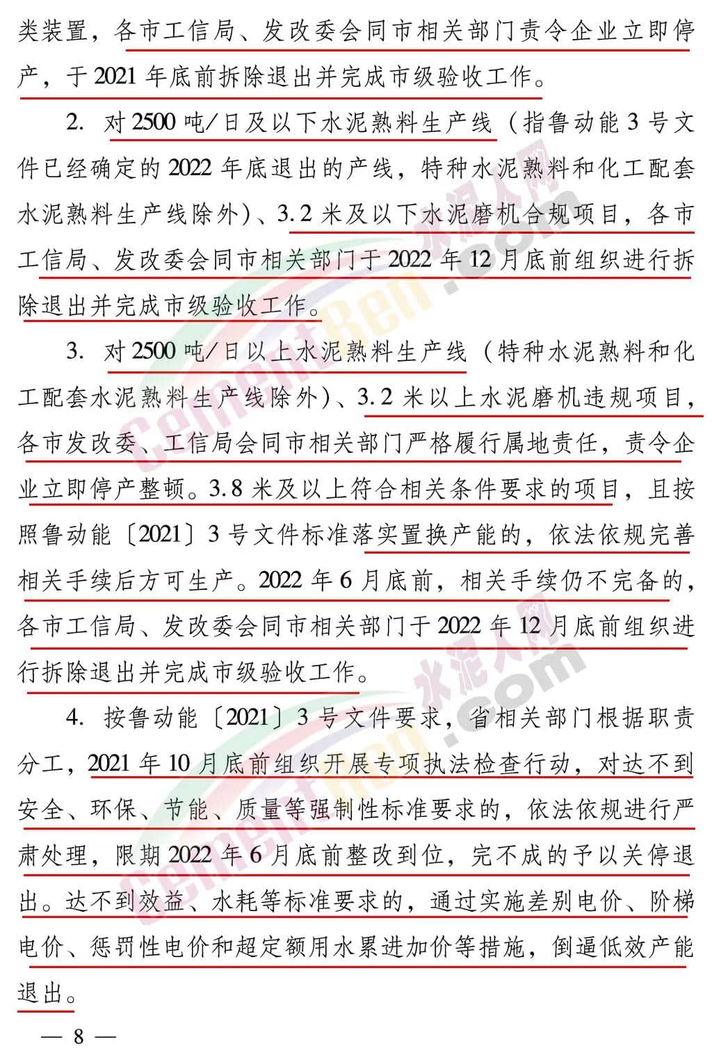 對2500噸/日以上水泥熟料生產線(特種水泥熟料和化工配套水泥熟料生產線除外)、3.2米以上水泥磨機違規項目,各市發改委、工信局會同市相關部門嚴格履行屬地責任,責令企業立即停產整頓。3.8米及以上符合相關條件要求的項目,且按照魯動能〔2021〕3號文件標準落實置換產能的,依法依規完善相關手續后方可生產。2022年6月底前,相關手續仍不完備的,各市工信局、發改委會同市相關部門于2022年12月底前組織進行拆除退出并完成市級驗收工作。