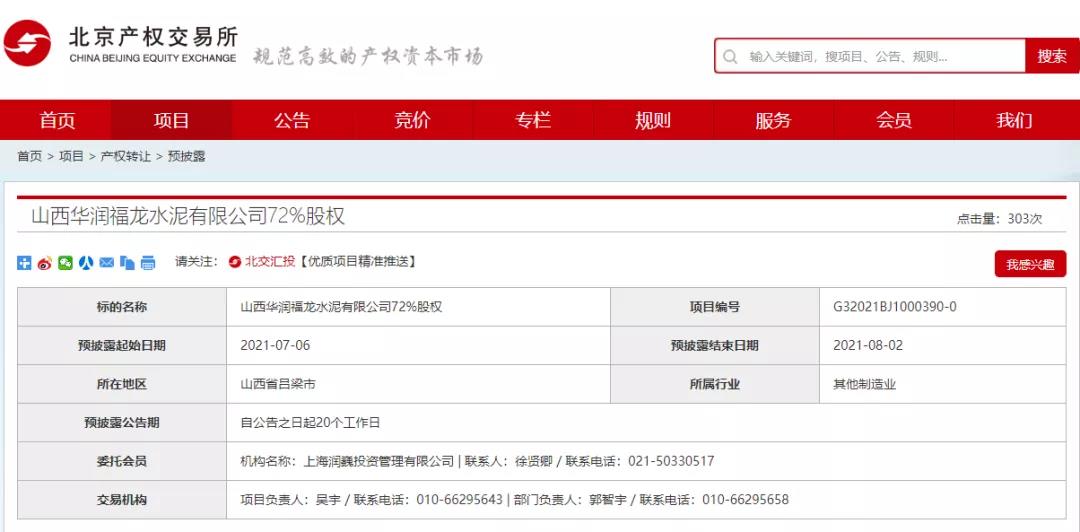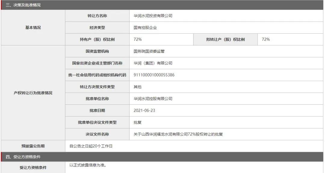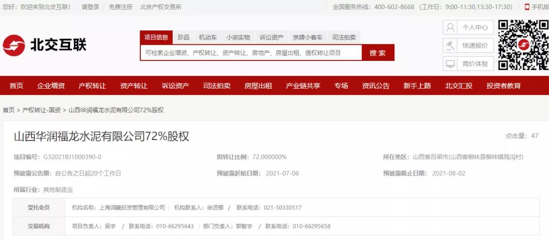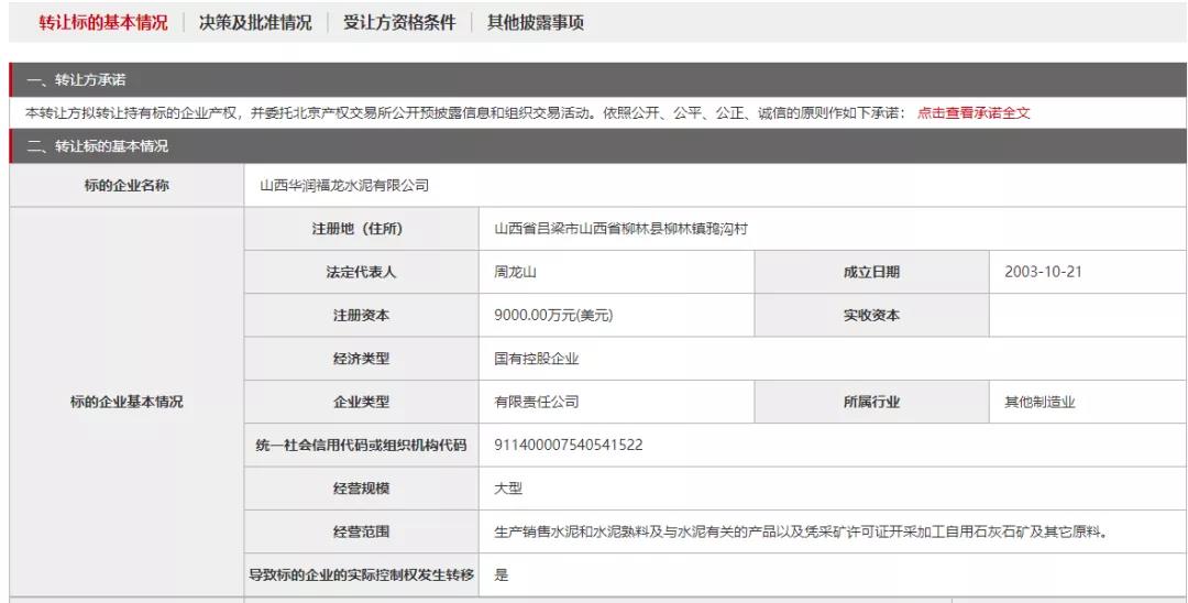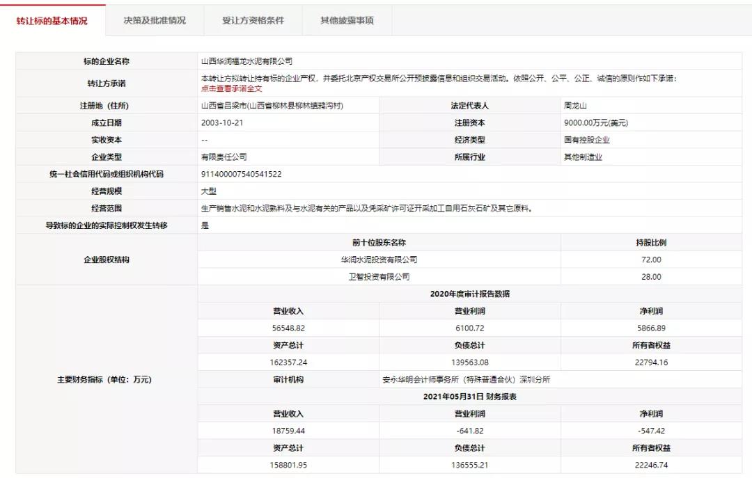 日前,北京產權交易所發布山西華潤福龍水泥有限公司72%股權轉讓消息,山西華潤福龍水泥有限公司注冊地(住所)山西省呂梁市山西省柳林縣柳林鎮鴉溝村。注冊資本9000.00萬元(美元),經濟類型國有控股企業。
