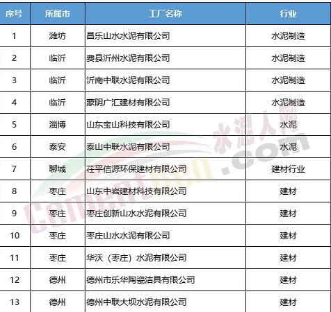 7月5日,山東省工業和信息化廳發布《省級綠色工廠(第一批)名單公示》。公示名單85家省級綠色工廠中,包括昌樂山水水泥有限公司、費縣沂州水泥有限公司、沂南中聯水泥有限公司、蒙陰廣匯建材有限公司、山東寶山科技有限公司、泰山中聯水泥有限公司、茌平信源環保建材有限公司、山東中巖建材科技有限公司、棗莊創新山水水泥有限公司、棗莊山水水泥有限公司、華沃(棗莊)水泥有限公司、德州中聯大壩水泥有限公司等13家水泥建材企業。