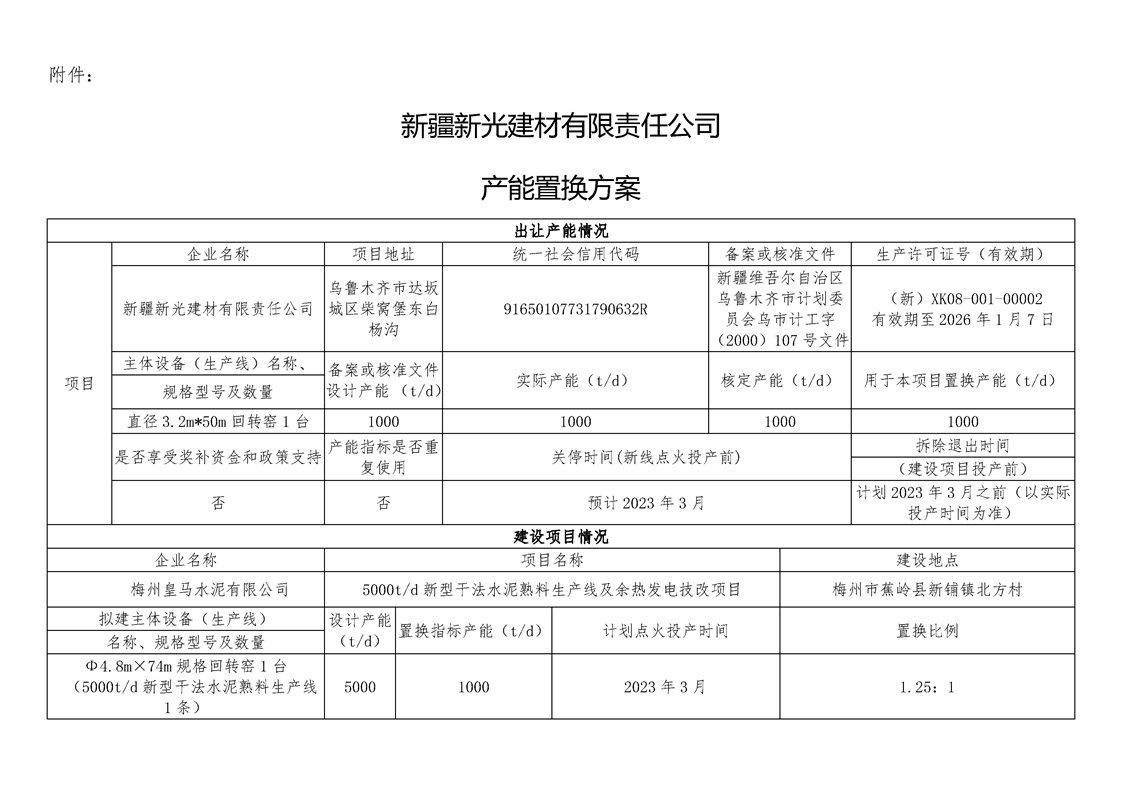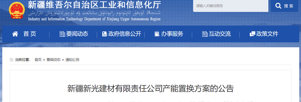 按照《國務院辦公廳關于促進建材工業穩增長調結構增效益的指導意見》(國辦發〔2016〕34號)、《工業和信息化部關于印發鋼鐵水泥玻璃行業產能置換實施辦法的通知》(工信部原〔2017〕337號)、《工業和信息化部辦公廳國家發展改革委辦公廳關于嚴肅產能置換嚴禁水泥平板玻璃行業新增產能的通知》(工信廳聯原〔2018〕57號)、《水泥玻璃行業產能置換實施辦法操作問答》要求,新疆維吾爾自治區工信廳于2021年6月1日至6月9日對《新疆新光建材有限責任公司產能置換方案》進行了公示,公示期間異議問題已得到處理。現將《新疆新光建材有限責任公司產能置換方案》予以公告,置換項目的生產線在新建項目投產前需完成拆除。