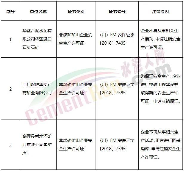 日前,水泥人網從四川省應急管理廳獲悉,根據《非煤礦礦山企業安全生產許可證實施辦法》第三十一條相關規定,決定依法注銷華鎣臺泥水泥有限公司華鎣溪口石灰石礦、四川峨勝集團石膏礦業有限公司、會理縣秀水河礦業有限公司尾礦庫等3家非煤礦礦山企業安全生產許可證。