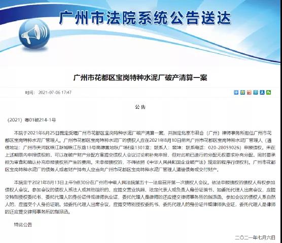 7月6日廣州市法院發布公告稱已于6月25日裁定受理廣州市花都區寶崗特種水泥廠破產清算一案,并指定北京市君合(廣州)律師事務所擔任廣州市花都區寶崗特種水泥廠管理人。債權人需在8月10日前向廣州市花都區寶崗特種水泥廠管理人申報債權。