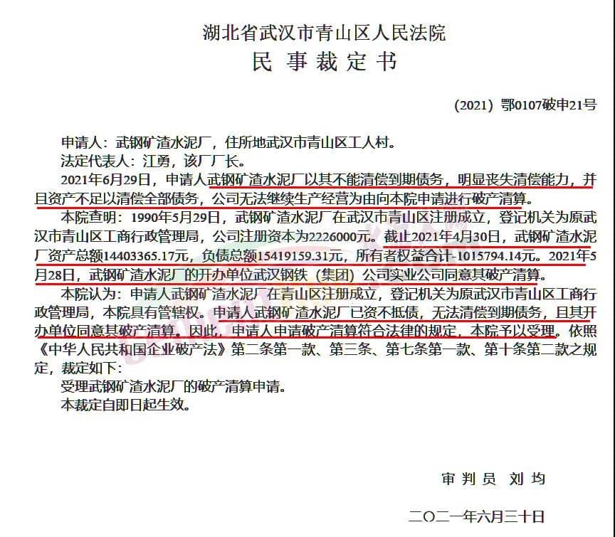 6月29日,申請人武鋼礦渣水泥廠以其不能清償到期債務,明顯喪失清償能力,并且資產不足以清償全部債務,公司無法繼續生產經營為由向法院申請進行破產清算。截止2021年4月30日,武鋼礦渣水泥廠資產總額約1440萬,負債總額約1542萬元,所有者權益合計約-101.58萬元。2021年5月28日,武鋼礦渣水泥廠的開辦單位武漢鋼鐵(集團)公司實業公司同意其破產清算。