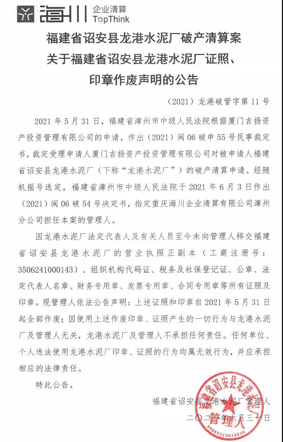 福建龍港水泥、江蘇運通水泥破產清算,證照、印章作廢