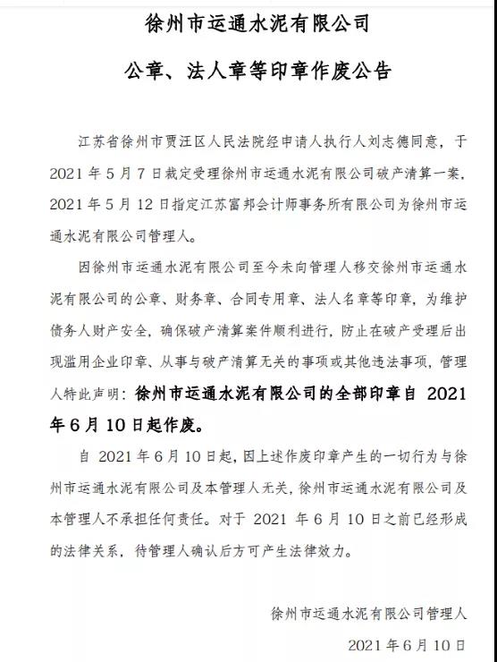 6月10日徐州市運通水泥有限公司管理人公告,江蘇省徐州市賈汪區人民法院經申請人執行人劉志德同意,于5月7日裁定受理徐州市運通水泥有限公司破產清算一案,并于5月12日指定江蘇富邦會計師事務所有限公司為徐州市運通水泥有限公司管理人。因徐州市運通水泥有限公司至今未向管理人移交徐州市運通水泥有限公司的相關證照和印章,管理人聲明徐州市運通水泥有限公司的全部印章作廢。