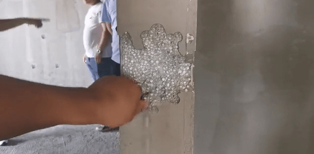 近日,陜西省渭南市蒲城縣西豐文苑小區(qū)3號樓、5號樓正交房,不少業(yè)主卻發(fā)現(xiàn),新房隔墻卻是用泡沫和著水泥制成的,有業(yè)主砸開部分隔墻后,斷茬處用手能摳下泡沫顆粒,擔憂不安全。