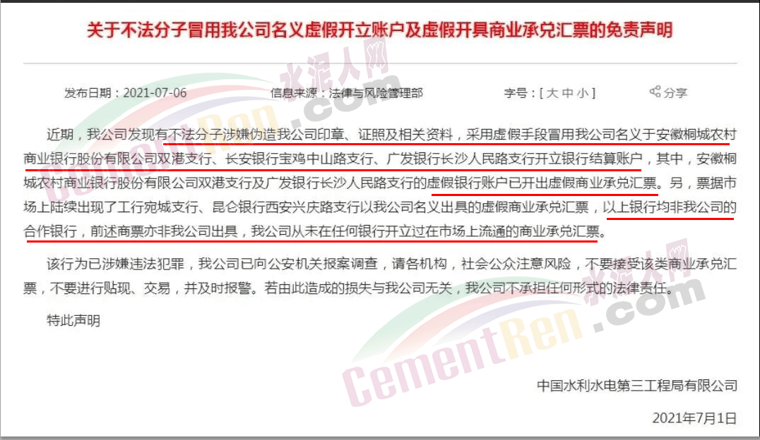 日前,中國水利水電第三工程局有限公司發布《關于不法分子冒用我公司名義虛假開立賬戶及虛假開具商業承兌匯票的免責聲明》稱,近期公司發現有不法分子涉嫌偽造中國水利水電第三工程局有限公司印章、證照及相關資料,采用虛假手段冒用中國水利水電第三工程局有限公司名義于開立銀行結算賬戶。并有部分虛假銀行賬戶已開出虛假商業承兌匯票。且公司從未在任何銀行開立過在市場上流通的商業承兌匯票。