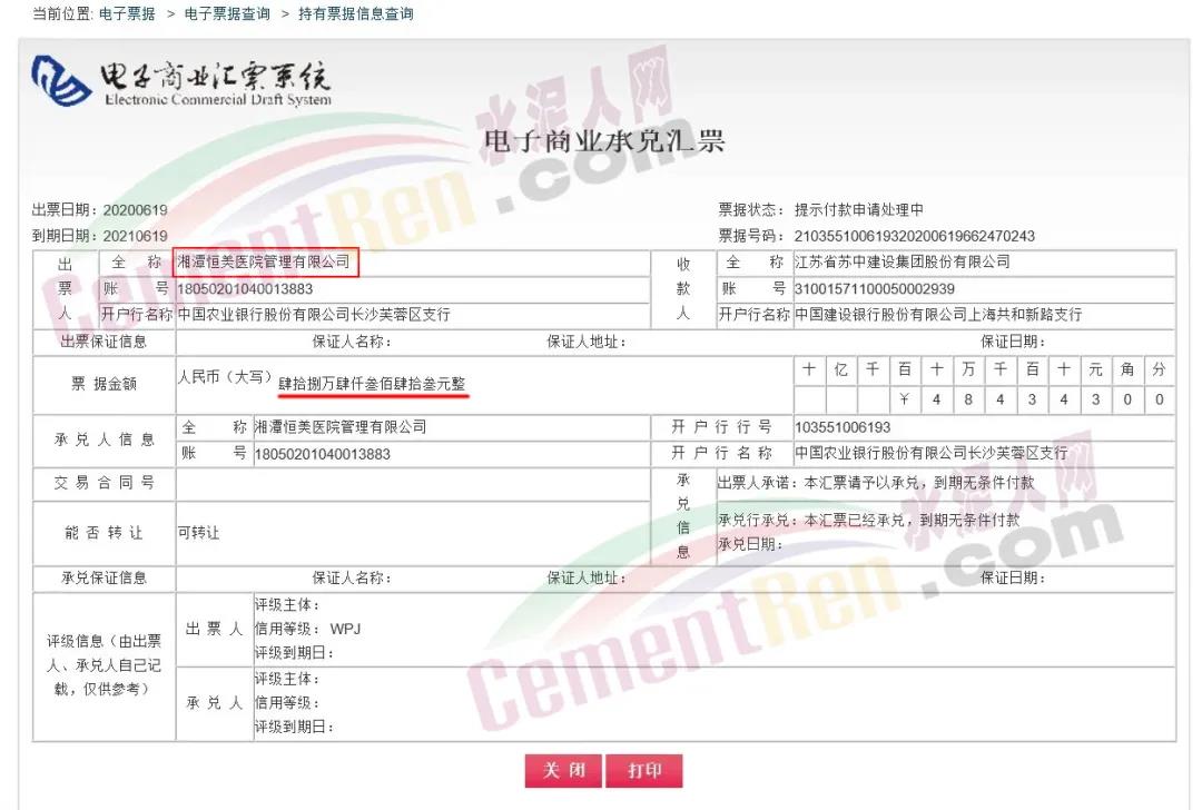 2021年6月19日,湘潭恒美醫院管理有限公司向江蘇省蘇中建設集團股份有限公司開出的一張一年期48.4萬元商業承兌匯票到期,債務人仍未付款,票據被申請付款處理中。